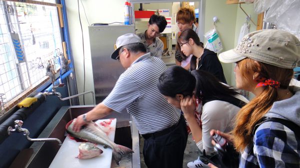 水産加工場にて。即席、お魚解体ショー or 花嫁講座?